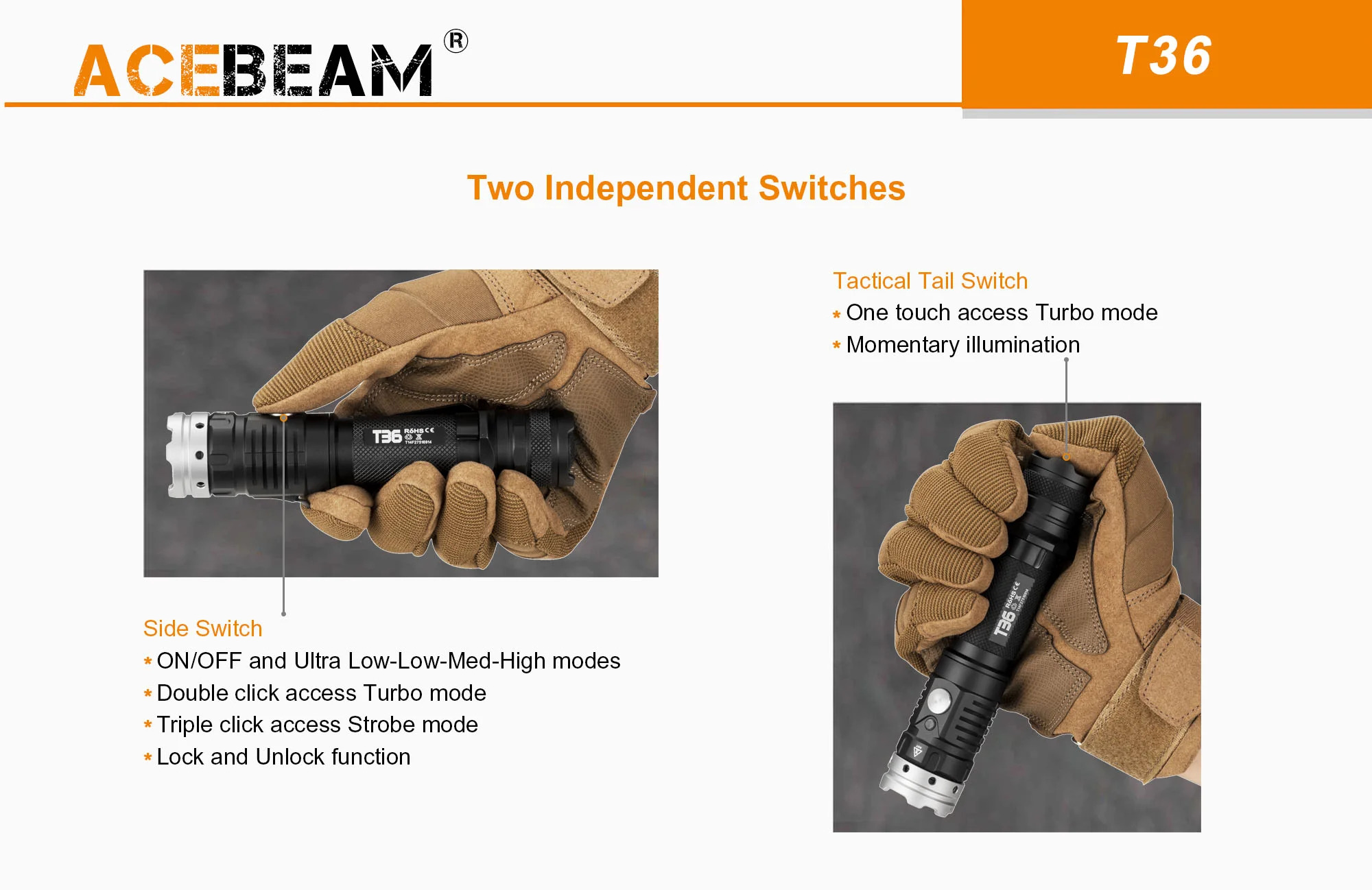 The tactical tail switch, tactical ring, strike bezel and overall output, not to mention the incredible beam profile of the Acebeam T36 make it an ideal EDC tactical duty flashlight!