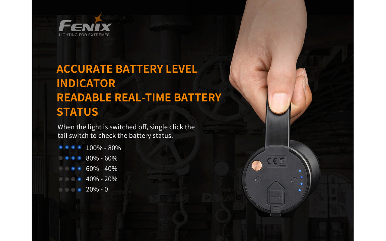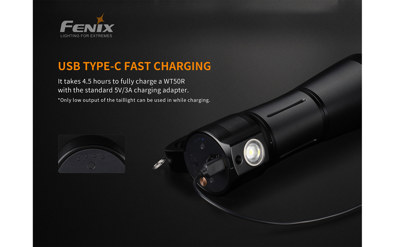 The tail end of the light has tons of business. First you’ll need to know that the battery for the WT50R is build in (boo) but has USB-C charging (yay!). The battery is a 7.4V 5200mAh battery. Some product photos do indicate that the battery is replaceable but of course it’s a proprietary Fenix battery.