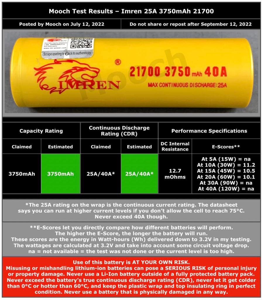 Mooch tested an Imren 21700 cell and describes it as a “good performer.”