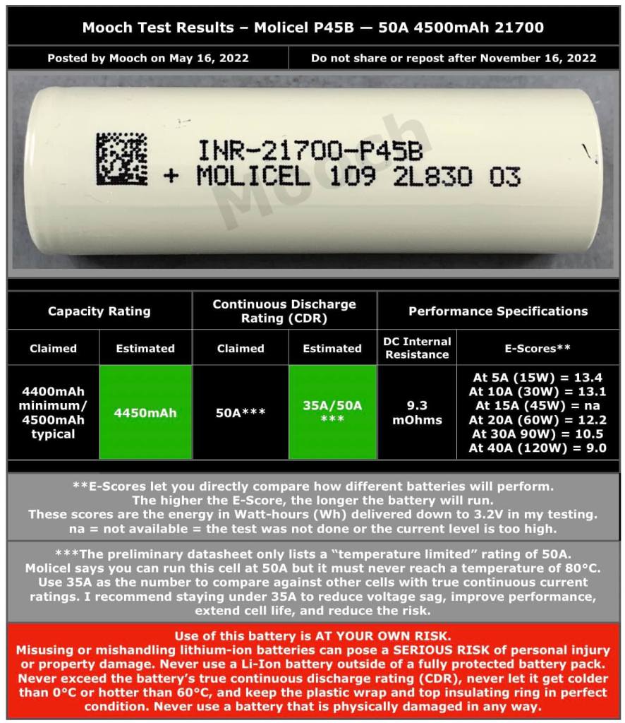 Another cell test by Mooch is this Molicel P45B. Mooch describes it as “an extraordinary cell.”