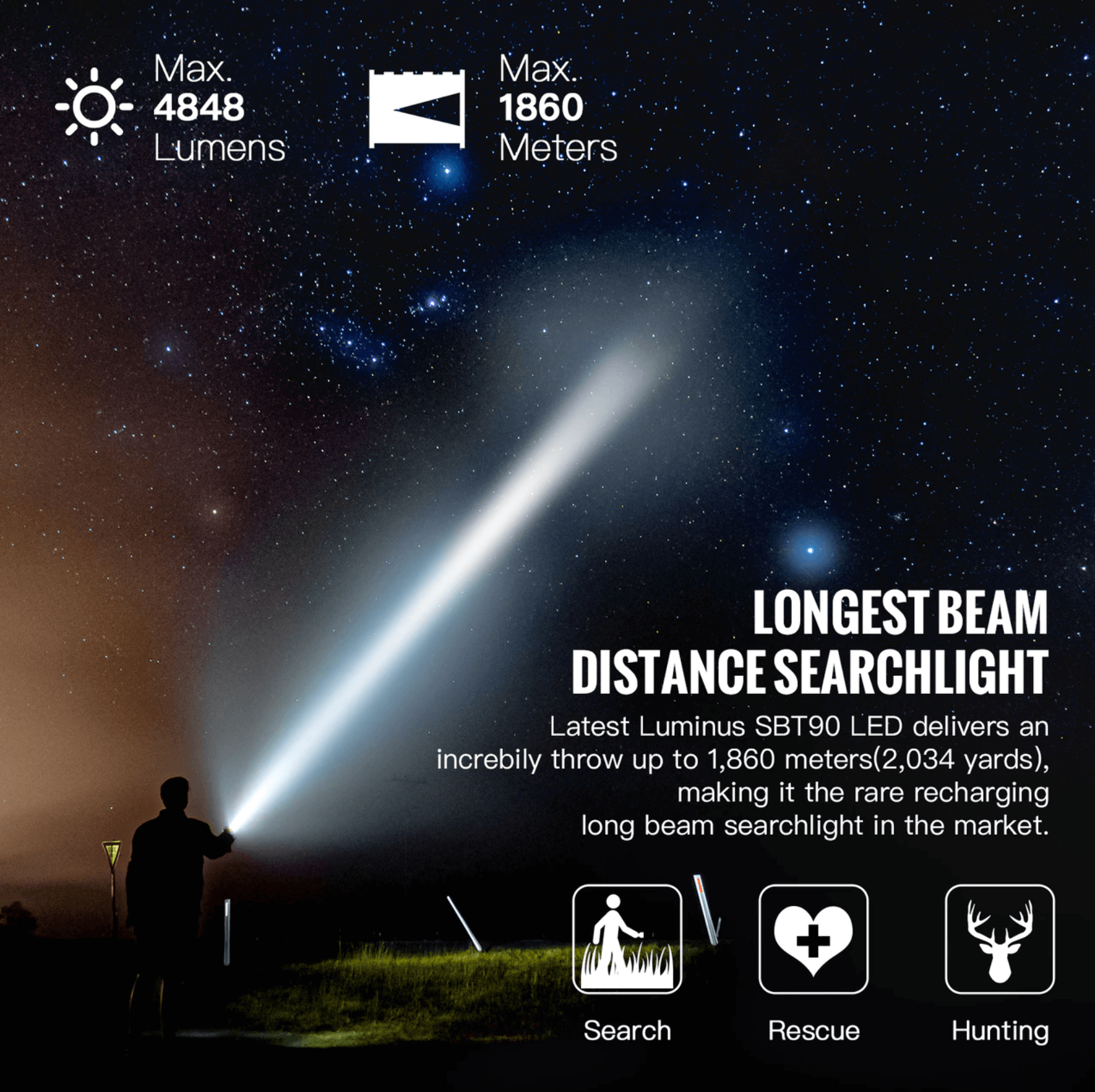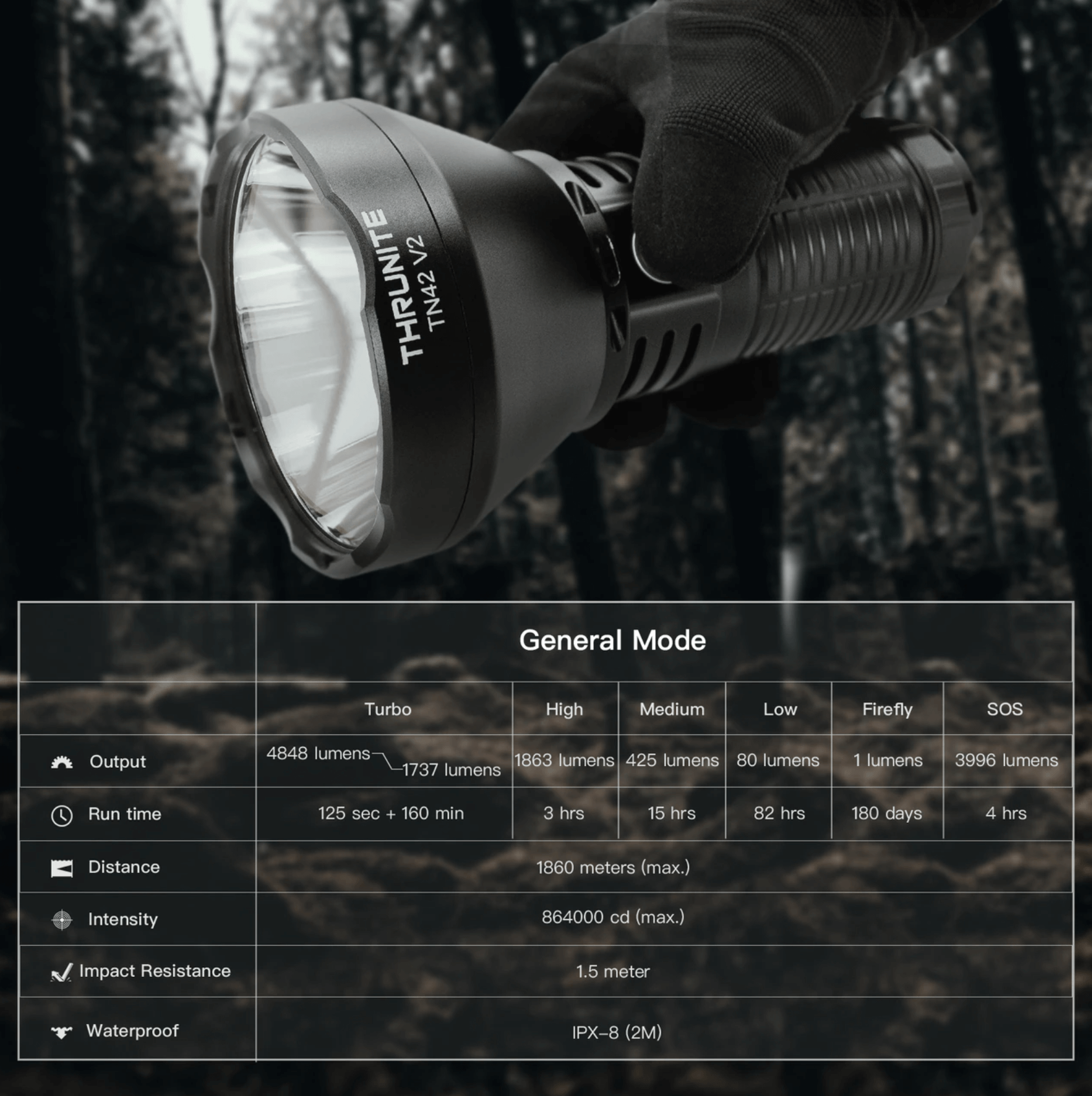 The Thrunite TN42 V2 boasts an impressive 4848 lumens and throws 1860 meters.